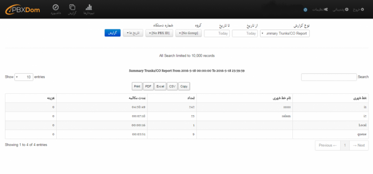 گزارش گیری از خلاصه وضعیت خطوط شهری به شما اجازه می دهد تا اطلاعات تکمیلی زیادی را از تماس ها در شرکت بدست آورید. هر خط شهری بسته به نوع برنامه ریزی که انجام داده اید دارای تماس های ورودی و خروجی است که می توانید گزارش آن را بر اساس تاریخ و حتی شماره داخلی دریافت کنید. این اطلاعات شامل آیتم های : خط شهری، نامی که برای آن خط شهری تعیین نموده اید، تعداد تماس ها، مدت زمان کل مکالمات و در نهایت هزینه ای که شما مشمول پرداخت آن مکالمات می باشد است.