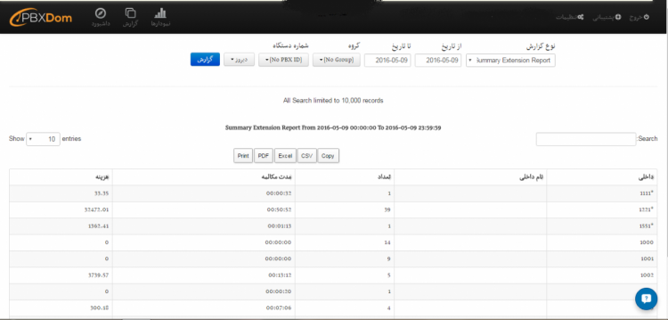 این اطلاعات شامل آیتم های : شماره داخلی ، نام داخلی ، تعداد کل تماس های داخلی فرد ذکر شده، مدت زمان کل مکالماتی که سپری شده است و در نهایت هزینه ای که شما مشمول پرداخت آن مکالمات می باشد است. با بررسی این گزارش به راحتی می توانید از فعالیت هایی که هر اپراتور و یا کارمندتان داشته است مطلع شده و با استفاده از گزارشات دیگری که در اختیار دارید از ریز هر یک از تماس ها اطلاعات جامع تری کسب نمایید.