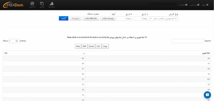 در این گزارش به صورت پیش فرض 25 شماره تلفن لیست می شود اما اگر خطوط شهری شما بیشتر و یا کمتر باشد می توانید آن را مدیریت کنید. اما ما به این نوع گزارشات، گزارشات 25تایی می گوئیم. جدول نهایی این ریپورت به شما فقط تعداد تماس های ورودی را نمایش می دهد و شماره خط را نمایش می دهد به طور مثال در عکس زیر مشاهده می کنید که خط شماره 07 بیشترین تماس ورودی را داشته است.
